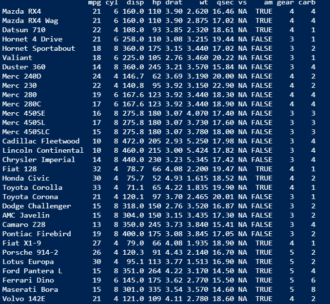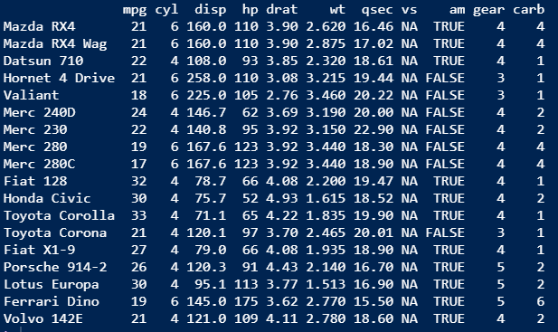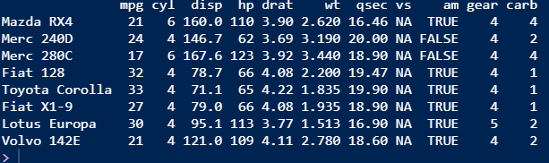 Suppose a researcher wants to subset the mtcars data set to only include cars with 4 and 6 cylinders.